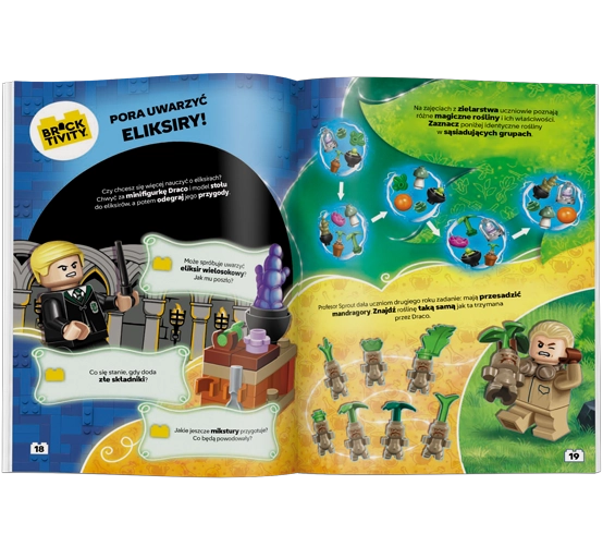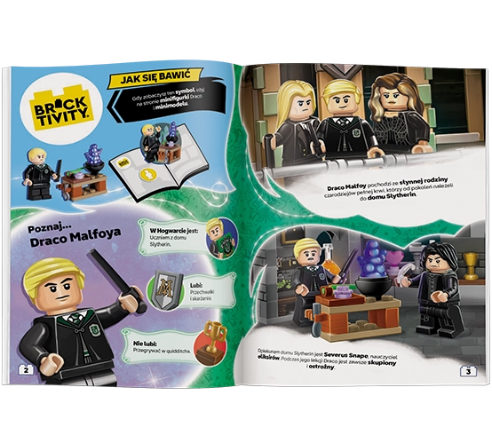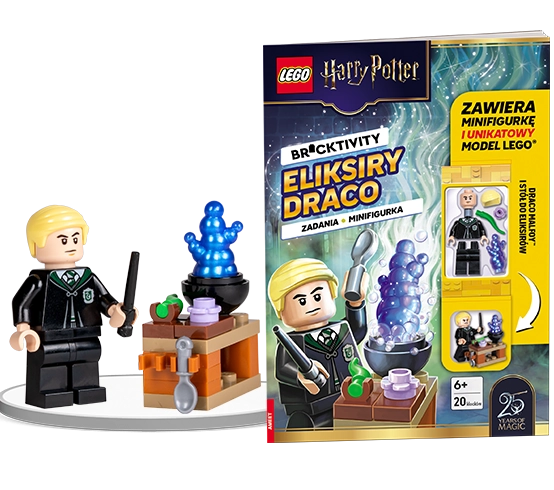 Draco Malfoy potrafi nieźle namieszać! Ciekawe, jak poradzi sobie z mieszaniem magicznych eliksirów… Książka z mnóstwem zadań i łamigłówek, a także ciekawostek o największym szkolnym rywalu Harry’ego Pottera ucieszy fanów serii, a dołączona minifigurka Draco Malfoya wraz ze stołem do eliksirów będzie ozdobą każdej kolekcji.