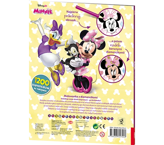 Fantastyczna nowość dla wszystkich fanów Minnie! Spraw, żeby błyszczała jak prawdziwa gwiazda – wszystko za sprawą aż 1200 diamencików, którymi możesz ozdobić ilustracje. Pokoloruj obrazki, a potem naklej barwne diamenciki w zaznaczonych lub wybranych przez siebie miejscach. Zabawa w kolorowanie i naklejanie pomaga ćwiczyć motorykę i uczy kolorów. Dzięki perforowanym stronom gotowe dzieła możesz wyjąć z książki i udekorować nimi swój pokój. Ta pozycja to świetny prezent dla małych artystów!