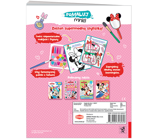 Zostań supermodną stylistką razem z Minnie! Możesz nie tylko stworzyć niepowtarzalne makijaże oraz fryzury, ale też zaprojektować idealny zestaw kolorowych kosmetyków dla Minnie i jej przyjaciółek. Książka zawiera gotową do użycia paletę barw. Wystarczy zamoczyć pędzelek w wodzie, wybrać odpowiednią farbkę i już można malować! To prawdziwa frajda dla małych stylistek!
