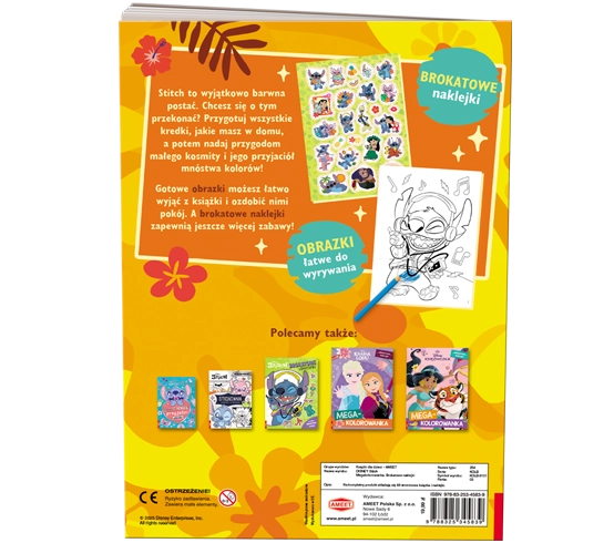 Stitch to wyjątkowo barwna postać. Chcesz się o tym przekonać? Przygotuj wszystkie kredki, jakie masz w domu, a potem nadaj przygodom małego kosmity i jego przyjaciół mnóstwa kolorów! Gotowe obrazki możesz łatwo wyjąć z książki i ozdobić nimi pokój. A brokatowe naklejki zapewnią jeszcze więcej zabawy!