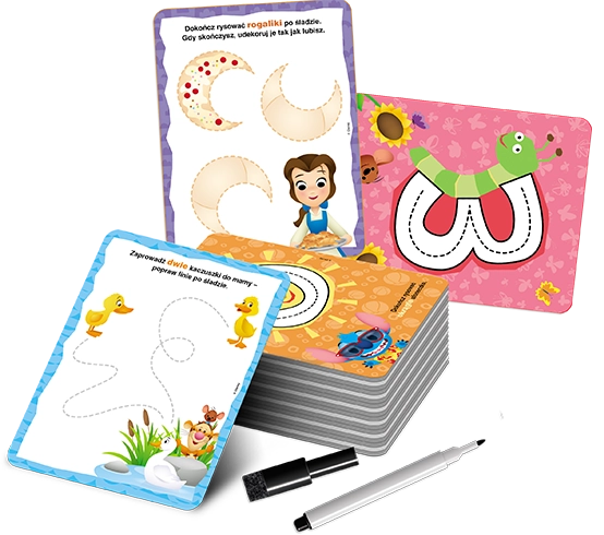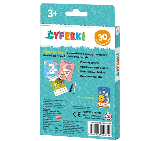 Zestaw ścieralnych kart z mazakiem, który pomoże maluszkowi stawiać pierwsze kroki w świecie cyferek. Zabawne kształty cyfr przypominające zwierzątka lub znane dziecku obiekty ułatwiają zapamiętywanie, a poprawianie po śladzie wspiera rozwój jego umiejętności manualnych. Ulubione postacie ze świata Disneya sprawiają, że nauka staje się świetną zabawą, a dzięki ścieralnemu mazakowi dziecko może wielokrotnie podejmować próby pisania.