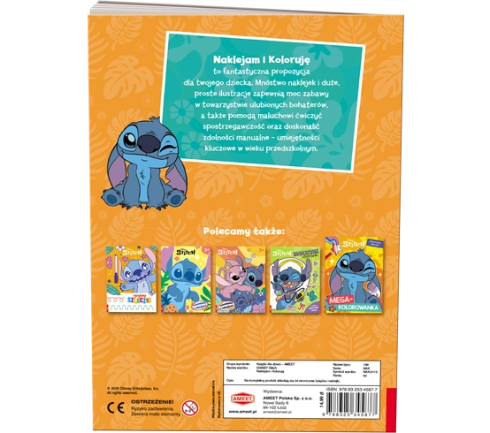 Czas na spotkanie z uroczym kosmitą Stitchem. Naklejam i Koloruję to fantastyczna propozycja dla Twojego dziecka, która zapewni mu moc zabawy w towarzystwie ulubionych bohaterów. Wklejając na stronach naklejki z odpowiednimi obrazkami, a następnie kolorując rysunki według wzoru, dziecko ćwiczy spostrzegawczość oraz doskonali zdolności manualne — kluczowe umiejętności dla wieku przedszkolnego.